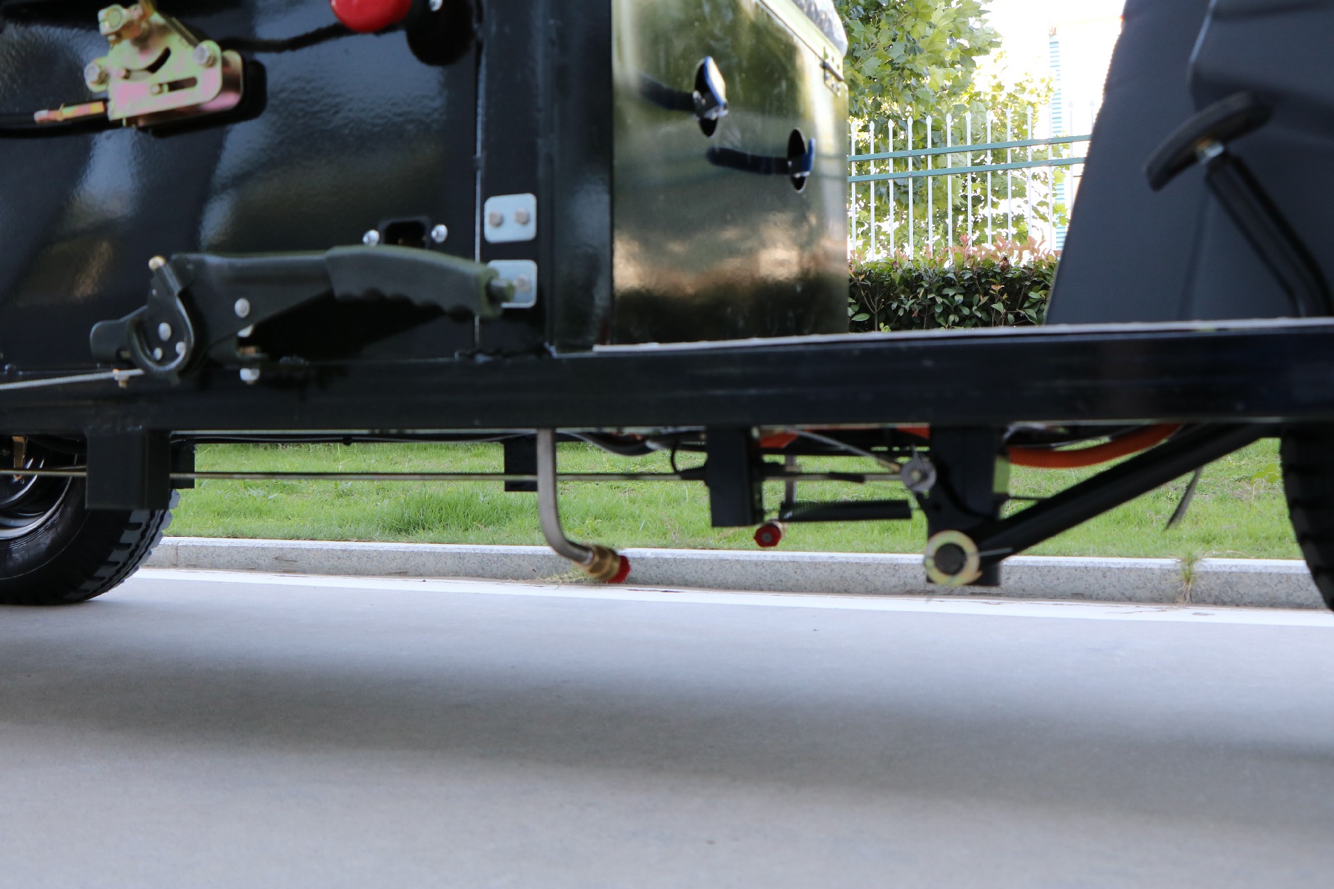 (8)配置兩組剎車裝置,駐車制動能同時制動雙后輪,確保路面行駛和作業安全;